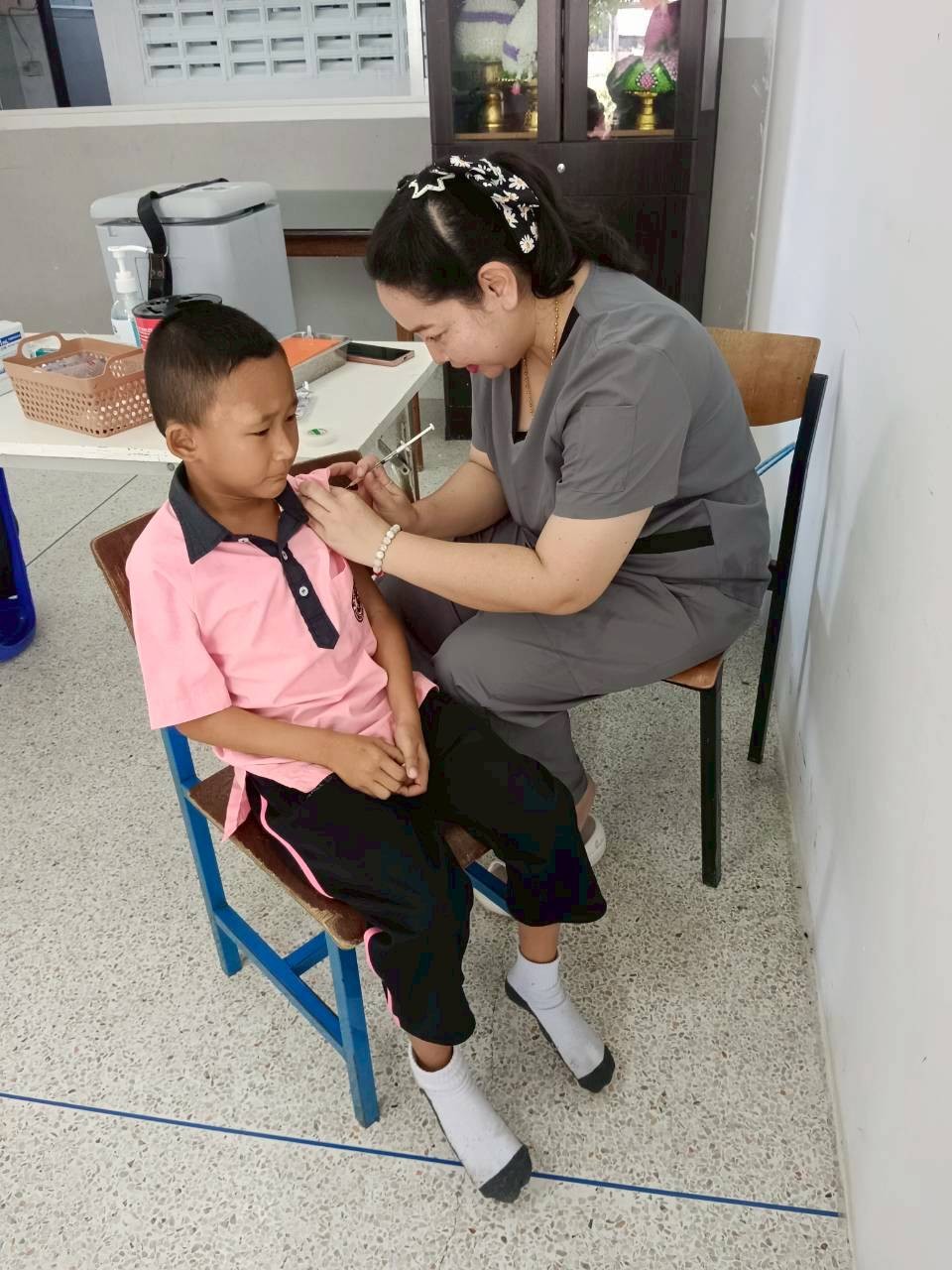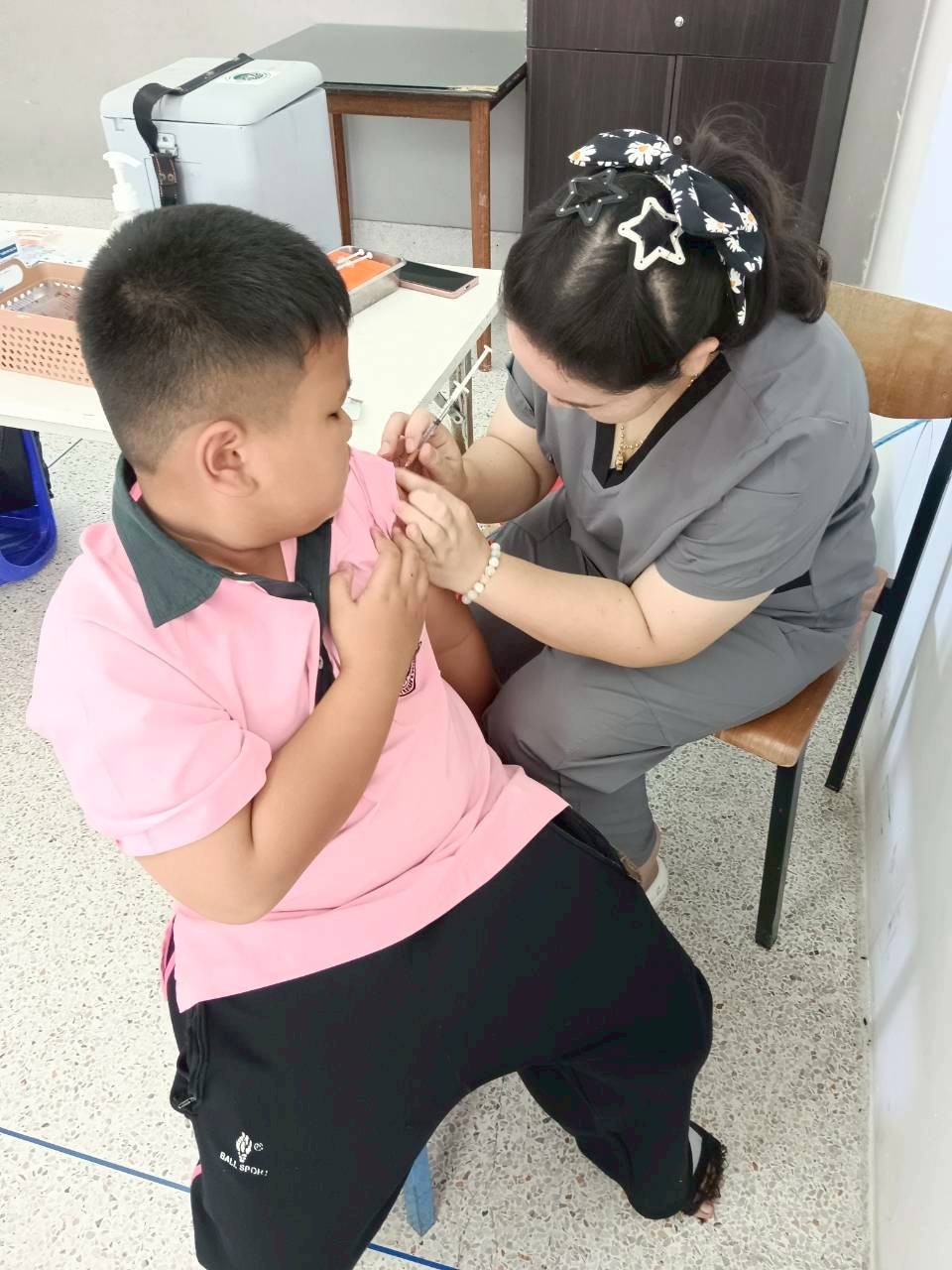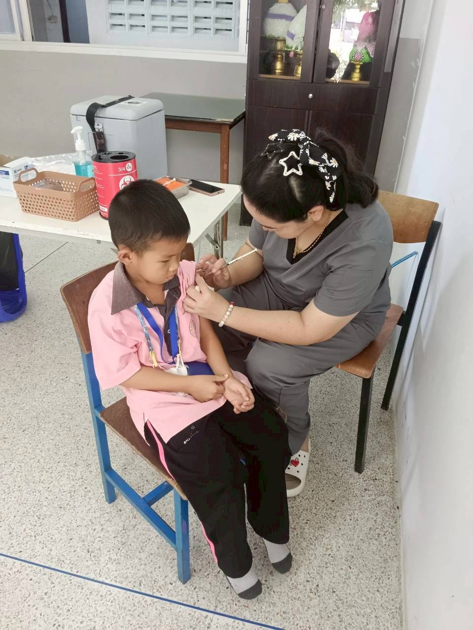 ในการนี้ ได้ให้บริการฉีดวัคซีนแก่นักเรียนชั้นประถมศึกษาปีที่ 1 ซึ่งเป็นนักเรียนที่มีประวัติการได้รับวัคซีนไม่ครบถ้วน ได้แก่ วัคซีนวัณโรค (BCG), วัคซีนคอตีบ-บาดทะยัก (dT), วัคซีนโปลิโอ (OPV และ IPV), วัคซีนหัด-คางทูม-หัดเยอรมัน (MMR) และวัคซีนไข้สมองอักเสบ (LAJE) โดยมีการตรวจสอบประวัติการได้รับวัคซีนจากสมุดบันทึกสุขภาพแม่และเด็ก (สมุดรับวัคซีน) ก่อนการให้บริการทุกครั้ง