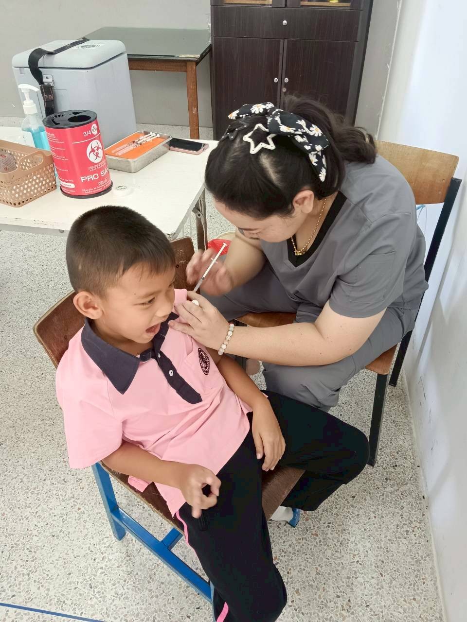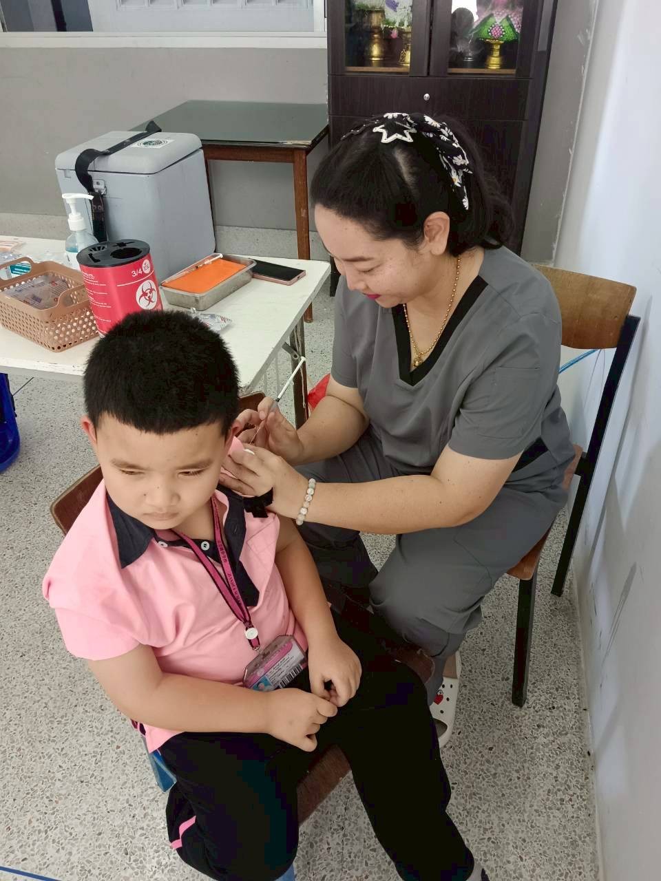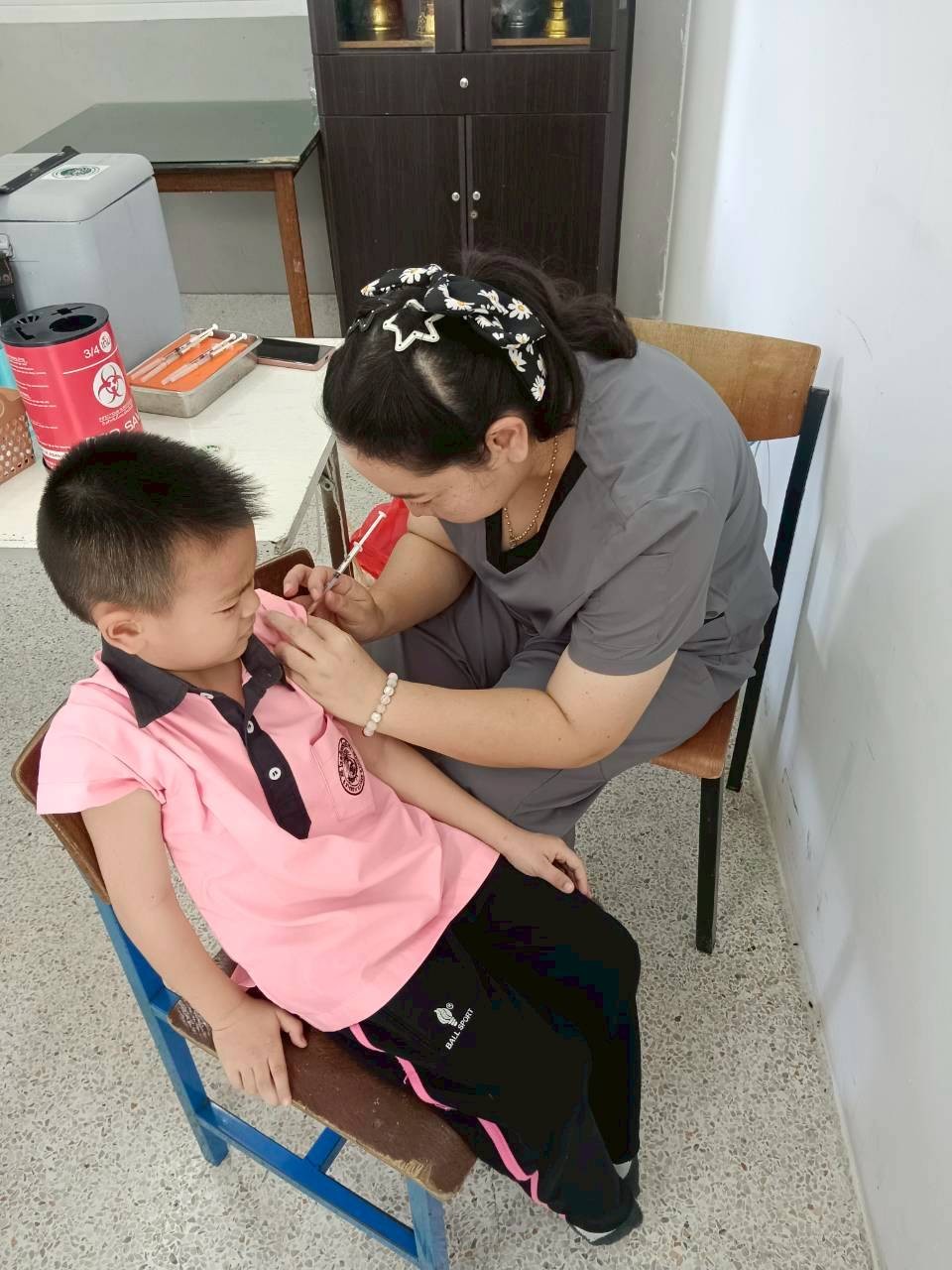 ในการนี้ ได้ให้บริการฉีดวัคซีนแก่นักเรียนชั้นประถมศึกษาปีที่ 1 ซึ่งเป็นนักเรียนที่มีประวัติการได้รับวัคซีนไม่ครบถ้วน ได้แก่ วัคซีนวัณโรค (BCG), วัคซีนคอตีบ-บาดทะยัก (dT), วัคซีนโปลิโอ (OPV และ IPV), วัคซีนหัด-คางทูม-หัดเยอรมัน (MMR) และวัคซีนไข้สมองอักเสบ (LAJE) โดยมีการตรวจสอบประวัติการได้รับวัคซีนจากสมุดบันทึกสุขภาพแม่และเด็ก (สมุดรับวัคซีน) ก่อนการให้บริการทุกครั้ง