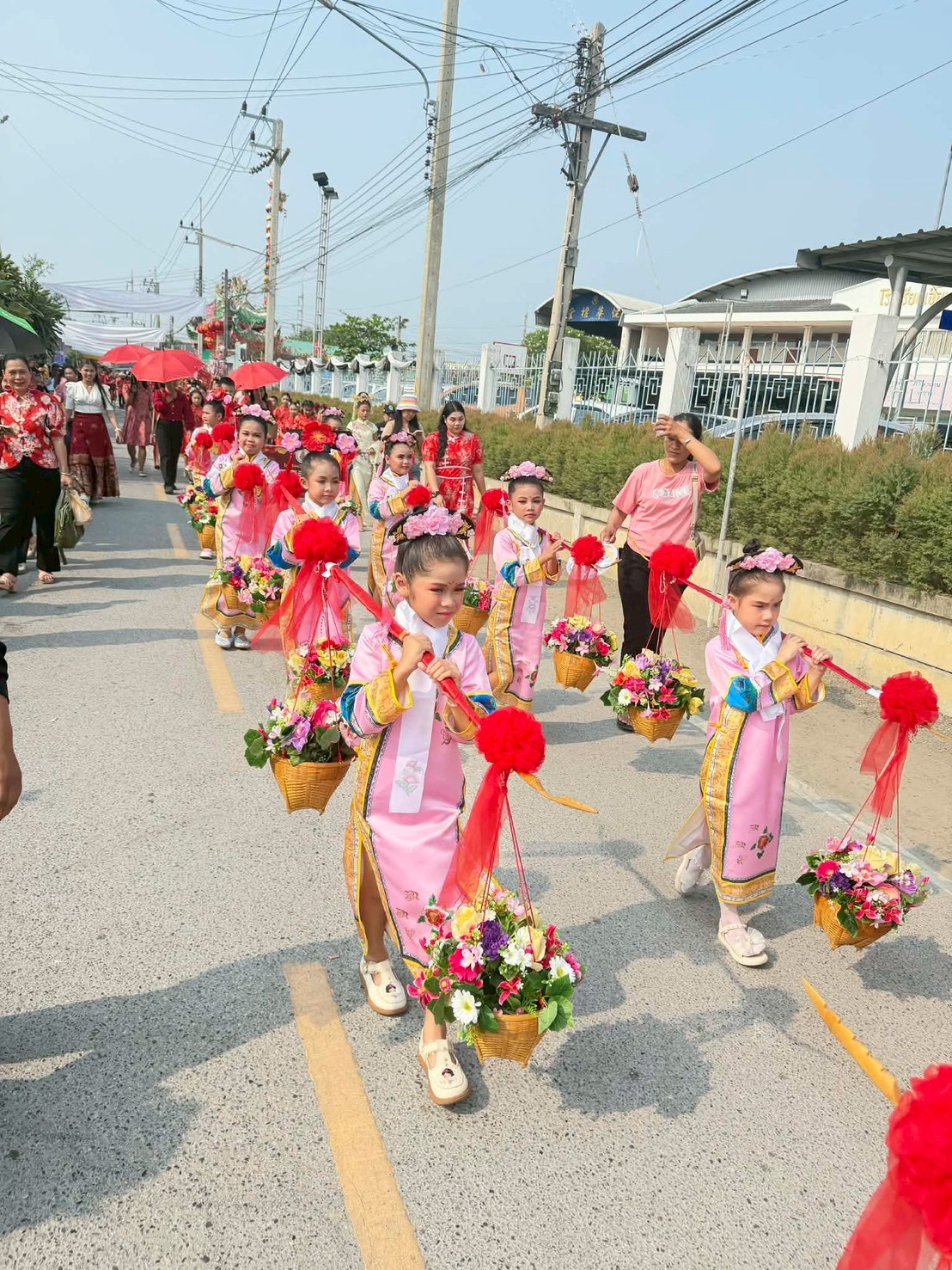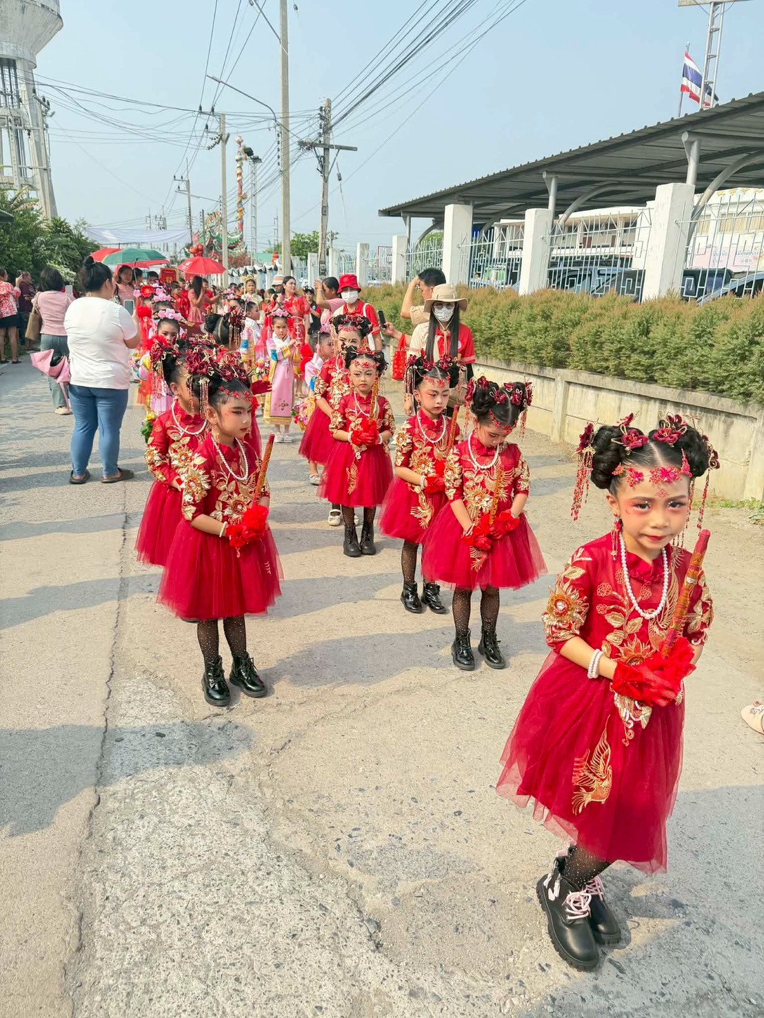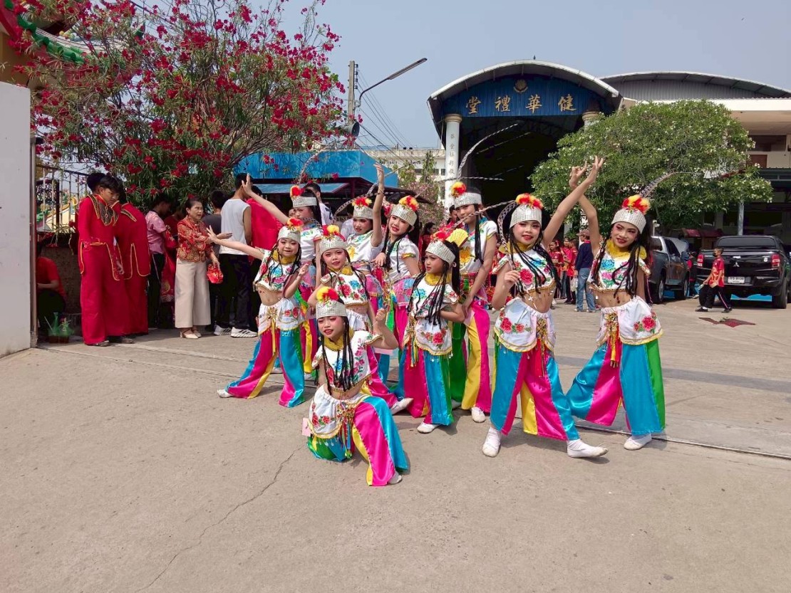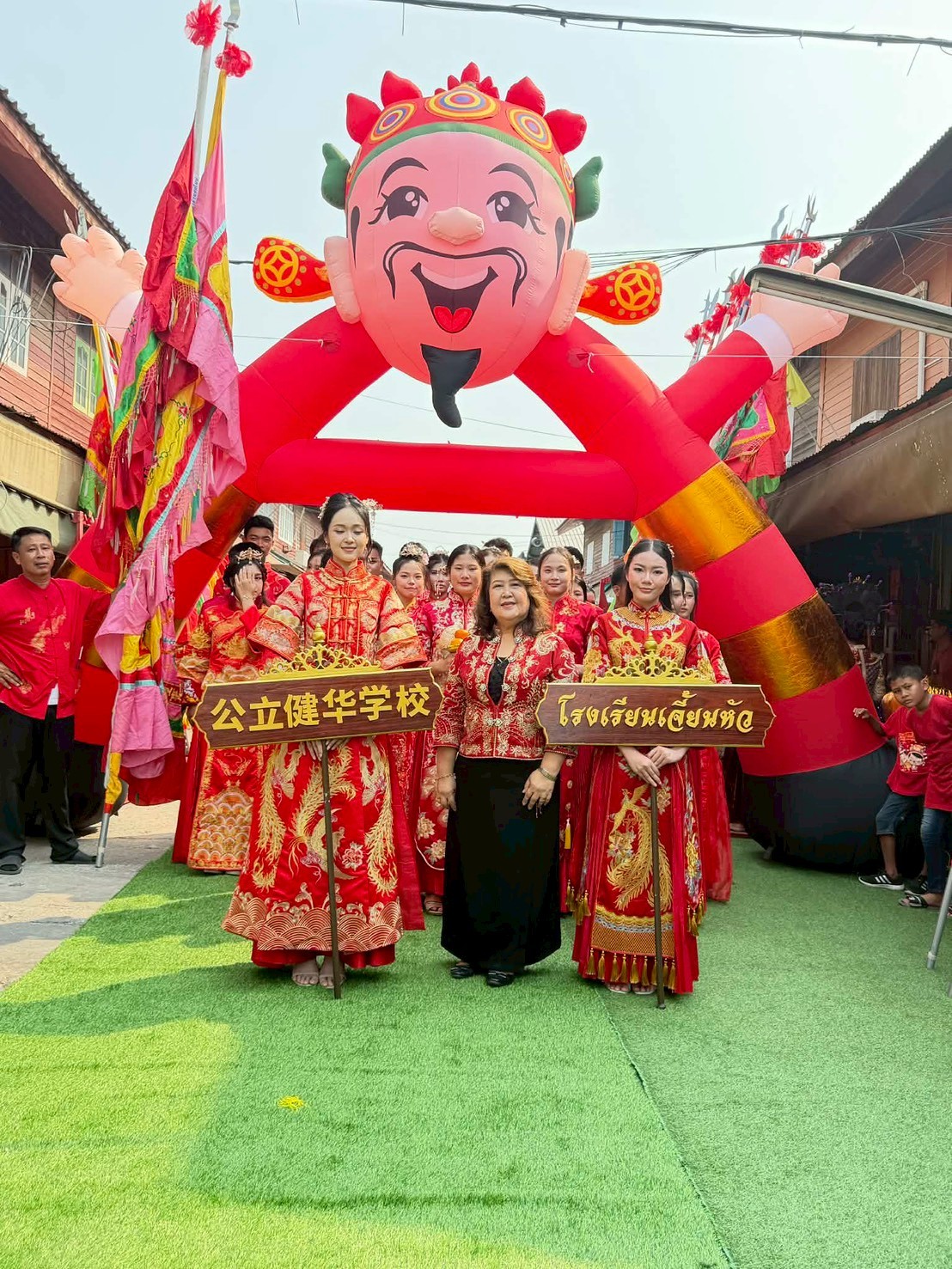 ในการนี้ นักเรียนโรงเรียนเจี้ยนหัวได้เข้าร่วมขบวนแห่อย่างพร้อมเพรียงและสง่างาม โดยร่วมถือธูปมงคลและหาบกระเช้าดอกไม้มงคลที่จัดตกแต่งอย่างประณีต อีกทั้งยังมีการบรรเลงดนตรีจีนอันไพเราะ สร้างบรรยากาศแห่งความรื่นเริงและเป็นสิริมงคลให้แก่ผู้ร่วมงาน นอกจากนี้ ยังมีการแสดงระบำสาวน้อยที่อ่อนช้อยงดงาม สะท้อนถึงความสามารถ ความตั้งใจ และความภาคภูมิใจของนักเรียนในการมีส่วนร่วมกับกิจกรรมสำคัญของชุมชน