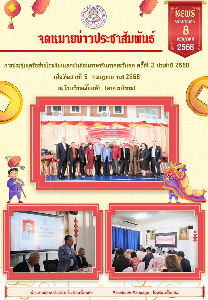 การประชุมเครือข่ายโรงเรียนเอกชนสอนภาษาจีนภาคตะวันตก ครั้งที่ 3 ประจำปี 2568 ได้จัดขึ้น ณ.โรงเรียนเจี้ยนหัว แผนกมัธยม คณะผู้บริหารและครูจำนวนกว่า 70 คน จาก 14 โรงเรียนในเครือข่ายได้ร่วมประชุม เพื่อหารือเกี่ยวกับการดำเนินกิจกรรมและการพัฒนาการศึกษาของเครือข่ายโรงเรียนเอกชนสอนภาษาจีนภาคตะวันตก โดยมีการแลกเปลี่ยนความคิดเห็นอย่างเป็นประโยชน์และอบอุ่น การประชุมครั้งนี้ได้รับความสำคัญจากหลายฝ่ายภายใต้การนำของท่าน ดร.แสงชัย โสตถีวรกุล ประธานสมาคมโรงเรียนสอนภาษาจีนแห่งประเทศไทยและเครือข่ายโรงเรียนเอกชนสอนภาษาจีนภาคตะวันตก พร้อมด้วยรองประธานเครือข่ายโรงเรียนเอกชนสอนภาษาจีนภาคตะวันตก ท่านกัมปนาท ตั้งกอบลาภ ท่านพลัฎฐ์ พนสิทธิวนา ร่วมชี้แนะทิศทางและสร้างฉันทามติสำหรับขั้นตอนการทำงานต่อไปของเครือข่าย ในฐานะเจ้าภาพ โดยมีประธานมูลนิธิโรงเรียนเจี้ยนหัว ท่านสมบัติ เจริญชัยประกิจ กล่าวต้อนรับโรงเรียนเครือข่ายอย่างอบอุ่น และยังมีผู้จัดการโรงเรียนเจี้ยนหัว คุณพีระวัฒน์ ค้าธัญเอกมงคล ผู้อำนวยการโรงเรียน ผอ.เยาวดี ใจซื่อ ครูใหญ่ภาคภาษาจีน คุณสิริกุล กิจทวีเลิศกุล รองผู้อำนวยการ คุณสิริลักษณ์ พงศ์พฤฒิชัย ผู้ช่วยผู้อำนวยการ คุณสุรเกียรติ ศรีสวัสดิ์ และคณะครูเข้าร่วมประชุมและให้การต้อนรับ