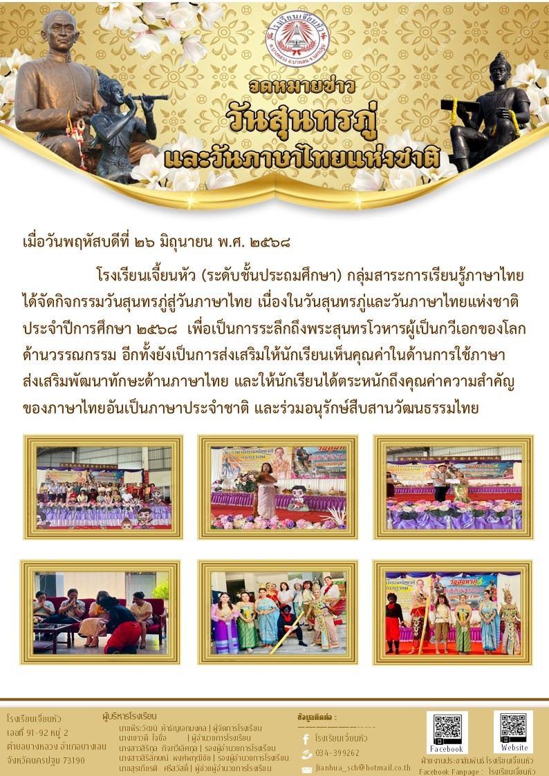 โรงเรียนเจี้ยนหัว (ระดับชั้นประถมศึกษา) กลุ่มสาระการเรียนรู้ภาษาไทย ได้จัดกิจกรรมวันสุนทรภู่สู่วันภาษาไทย เนื่องในวันสุนทรภู่และวันภาษาไทยแห่งชาติ ประจำปีการศึกษา 2568 เพื่อเป็นการระลึกถึงพระสุนทรโวหารผู้เป็นกวีเอกของโลก ด้านวรรณกรรม อีกทั้งยังเป็นการส่งเสริมให้นักเรียนเห็นคุณค่าในด้านการใช้ภาษา ส่งเสริมพัฒนาทักษะด้านภาษาไทย และให้นักเรียนได้ตระหนักถึงคุณค่าความสำคัญของภาษาไทยอันเป็นภาษาประจำชาติ และร่วมอนุรักษ์สืบสานวัฒนธรรมไทย
