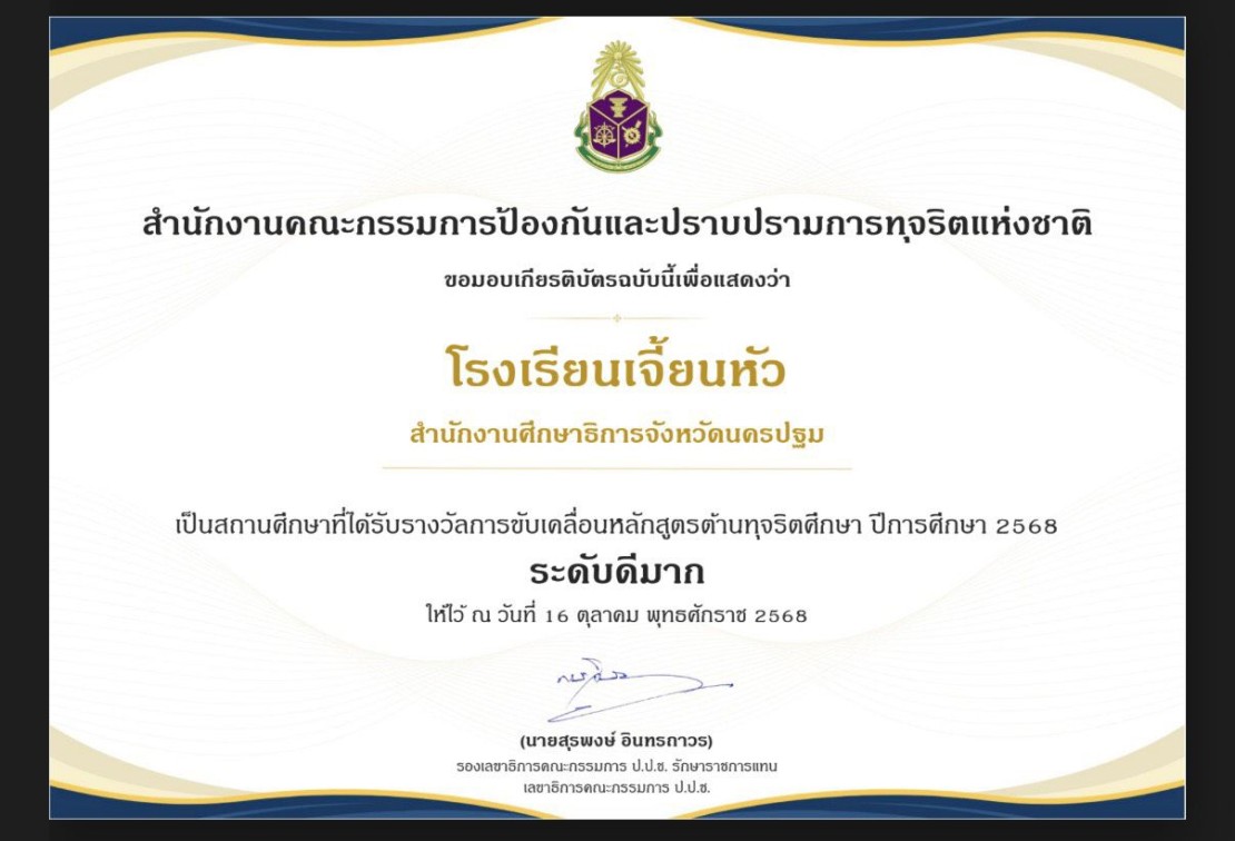 โรงเรียนเจี้ยนหัวได้รับ รางวัลสถานศึกษาที่นำหลักสูตรต้านทุจริตศึกษาไปใช้ในการจัดการเรียนการสอน ระดับดีมาก